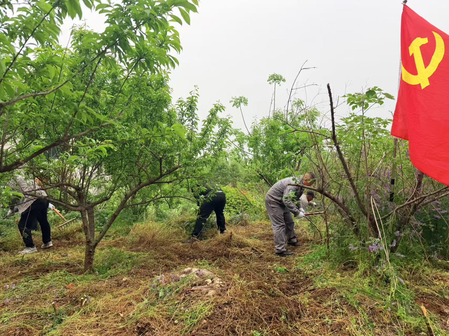 活動(dòng)現(xiàn)場(chǎng),黨旗飄揚(yáng),熱情高漲。黨員們沖鋒在前,帶領(lǐng)職工分組包片,展開(kāi)拉網(wǎng)式清理。大家手持鐮刀、鐵鍬,俯身勞作,清除果樹(shù)下的雜草,既消除了消防安全隱患,又為果樹(shù)生長(zhǎng)騰出了充足的養(yǎng)分空間。這片由職工親手栽種的樹(shù)林長(zhǎng)勢(shì)喜人,成為“綠水青山就是金山銀山”理念的鮮活注腳。