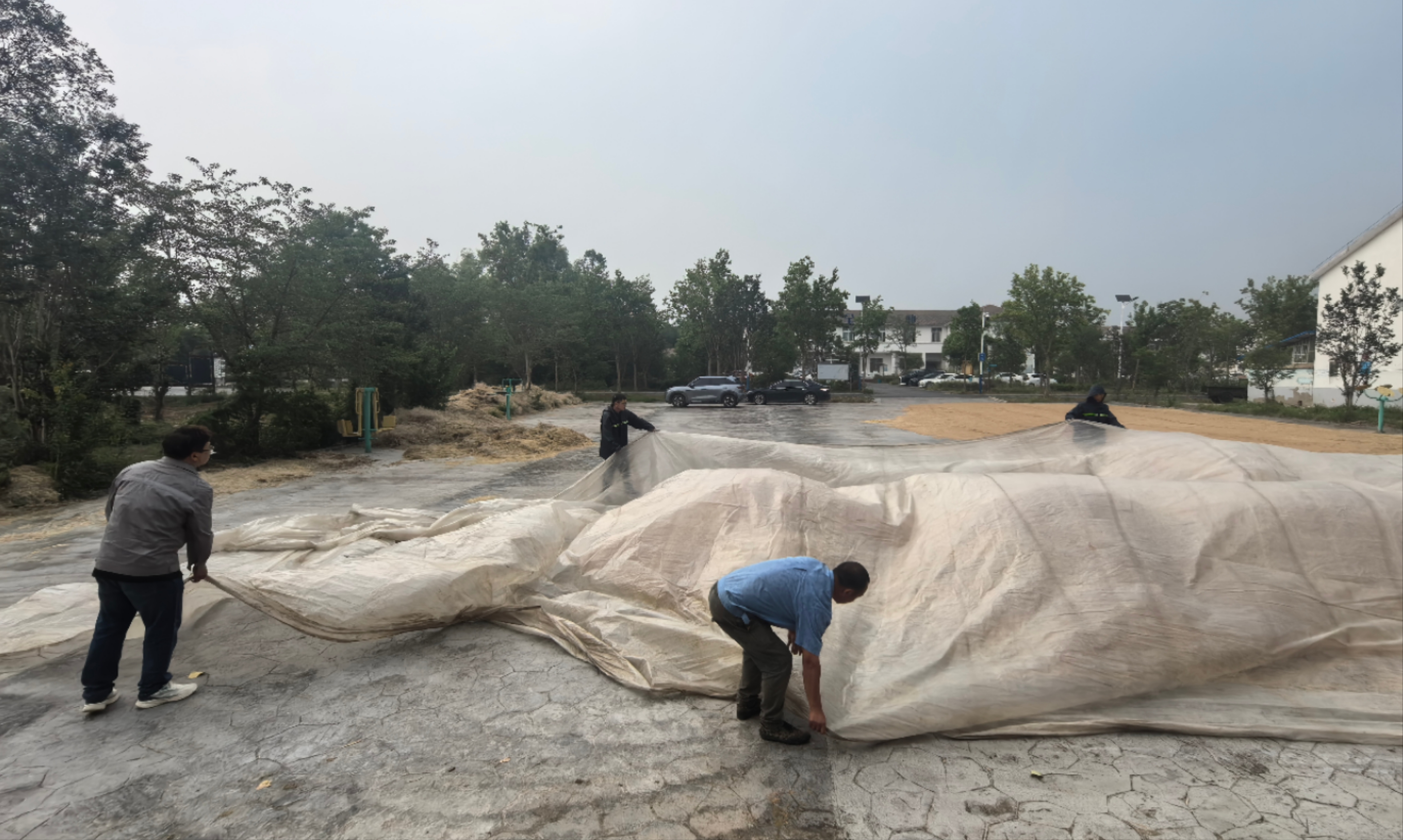 志愿者們拿起推糧鏟、鐵鍬、大掃帚,對(duì)糧堆邊緣散落的小麥進(jìn)行集中歸攏,并迅速用防水雨布對(duì)糧堆進(jìn)行覆蓋,有效防止因雨水滲透導(dǎo)致的糧食霉變損耗風(fēng)險(xiǎn)。